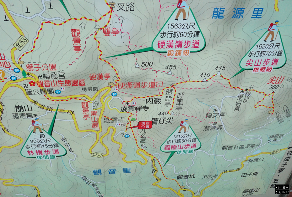 發現這條健行路線還不錯,難度屬休閒級,走走一路還可到觀音山凌雲禪寺,那觀音山土雞園、碧瑤山莊都會到,
