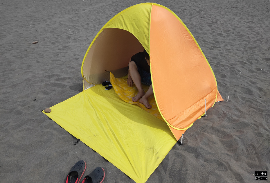 自從有了小帳棚後,到海邊就很方便,太曬或風太大的地方瞬間派上用場,『觀音濱海遊憩區』離海很近的地方,